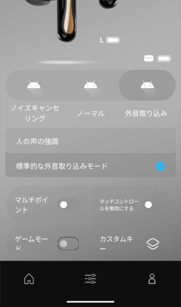 外音取り込みのモードは標準と人の声を聞きやすくするの2パターンです。